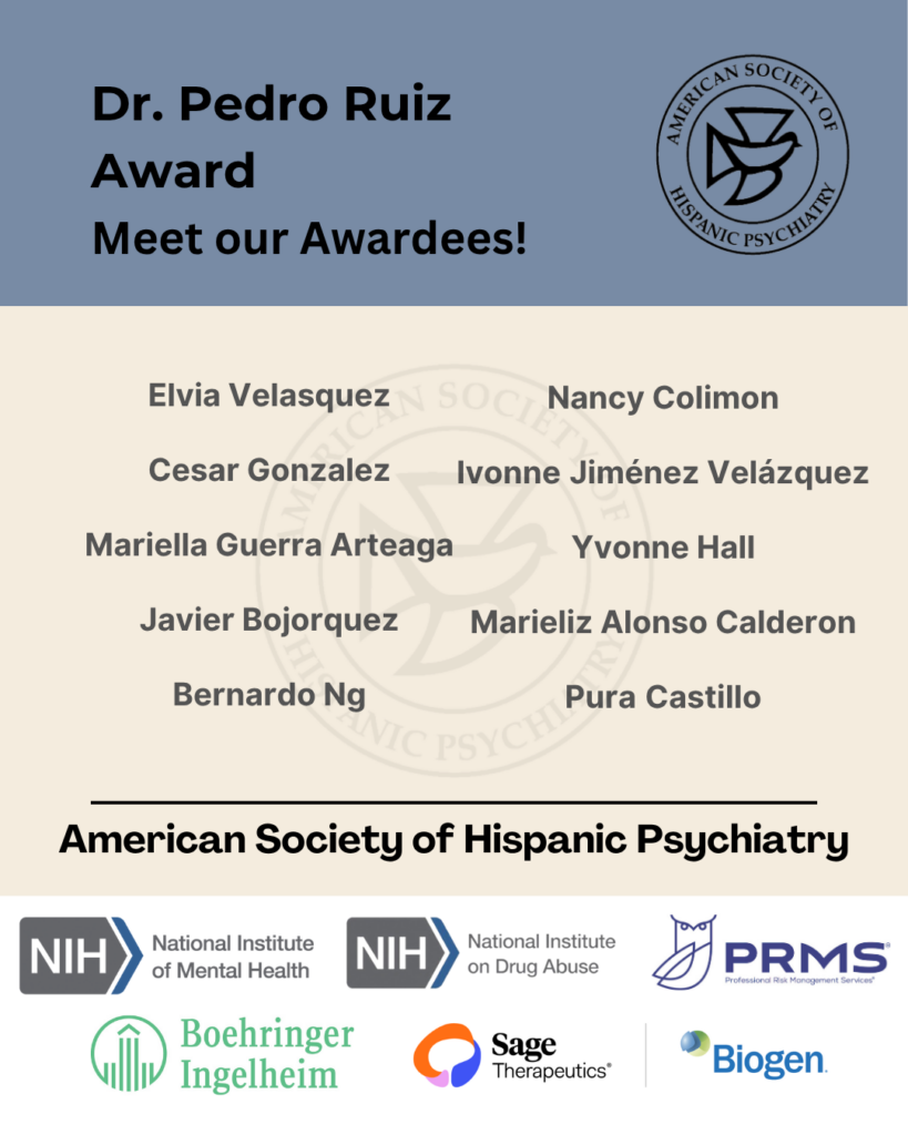 In 2024, ASHP officially renamed its Lifetime Achievement Award as the Pedro Ruiz Award, in recognition of Dr. Ruiz’s legacy as a pioneering leader, mentor, and advocate. His lifelong dedication to advancing psychiatric care for Hispanic communities and nurturing future generations of mental health professionals continue to inspire our work. This award is a tribute to his remarkable contributions and enduring impact.